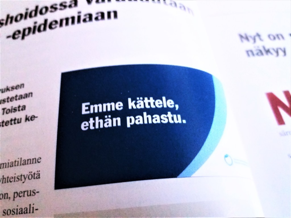 Opiskelin hammaslääkäriksi silloin, kun sikainfluenssa saapui Suomeen. Tuntematon virus pelotti maailmaa, ja Suomen Hammaslääkäriliitto teki ansiokkaan osansa epidemian hillinnässä. Hammaslääkärilehden liitteenä lääkäreille jaettiin hoitohuoneiden oviin kylttejä, joissa ohjattiin välttämään kättelyä. Kättelystä luopuminen iskostui toimintakulttuuriin niin hyvin, että kättelystä on tullut hammashoidossa harvinaista. Niin harvinaista, että tätä kylttiä ei enää tarvita, koska kukaan ei kättele.