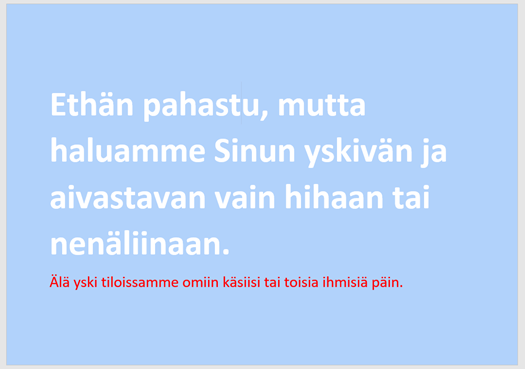 Tämä ei kuitenkaan vielä riitä. Jo sikainfluenssan aikaan puhuttiin myös siitä, että toisia päin ei pidä aivastaa eikä yskiä, mutta näyttää siltä, että niillä kehotuksilla ei ole saatu ihmeitä aikaan.