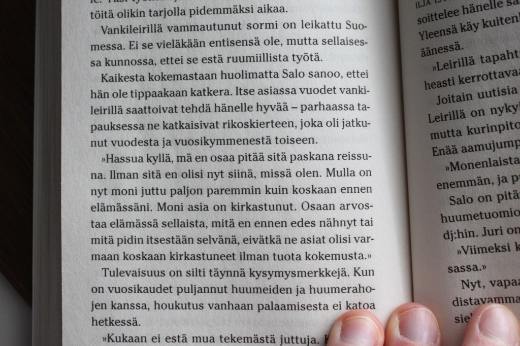 En tiedä, onko Jan Salo hänen oikea nimensä. Sen tiennee toimittaja Ilkka Karisto, joka on tavannut ja puhelimitse kuullut Saloa kymmeniä kertoja tätä kirjaa varten. Mutta nyt jätän Salon henkilön tähän, sillä rikolliseen elämään on kuulunut myös muille aiheutunutta haittaa, eikä niille toimille ole syytä antaa enempää näkyvyyttä. Toisaalta kuten kirjassa kerrotaan, Venäjän vankiloissa istuu myös huomattavan paljon syyttömiä ihmisiä (joskus myös suomalaisia) ja tämä blogikirjoitus olisi voinut syntyä kenen tahansa syyttömänkin tarinasta. Pointti ei ole rikollisessa, vaan poikkeusoloissa.