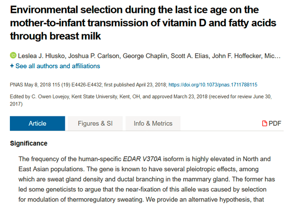 No, tämä riittää tiedoksi minulle. EDAR V370A, vauvojen imettäminen, poimuileva etuhammas ja riittävä D-vitamiinin saanti imeväisiässä. Melkoista.