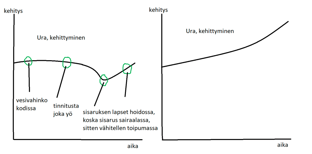 Ihmisten elämän ajattelee helposti olevan oikeanpuoleista. Useimmiten se on kuitenkin vasemmanpuoleista. Miten iso saavutus on jo se, että saa aikaan tasaisen viivan: pystyy työhön, pystyy suunnilleen olemaan mukava työkaveri ja perheenjäsen ja pystyy tulemaan ihmisten ilmoille, hoitamaan asioita. Jaksaa edes perusasiat: toivottaa hyvää huomenta, odottaa suunvuoroa, puhua nätisti ja ojentaa oikea instrumentti. Voi miten paljoon se riittää. Koska kapasiteetin kannalta käytössä voi olla kaikki (alempi kuva). Joskus kaikkensa tekeminen johtaa tasaiseen viivaan. Siksi tasainen viivakin on niin arvokas. Joskus se on jopa huippusuoritus. Tulla töihin ajoissa, sanoa huomenta ja heihei, tehdä välttämättömät.