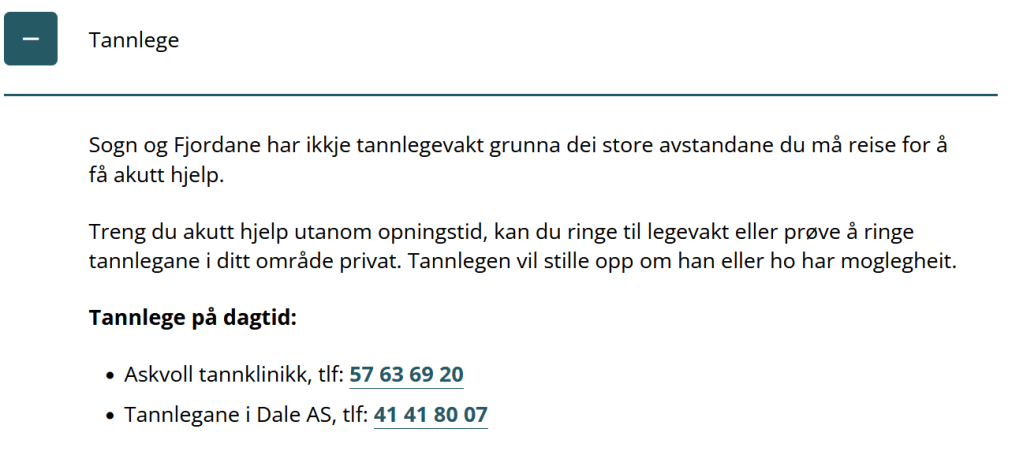 Kuva yllä: Fjalerin kunnan nettisivut kertovat, että Kainuun kokoisella alueella ei ole tarjolla hammaslääkäripäivystystä virka-ajan ulkopuolella. Syyksi kerrotaan liian pitkät välimatkat, jotta palvelusta olisi hyötyä asukkaille verrattuna Bergeniin saakka matkaamiseen.