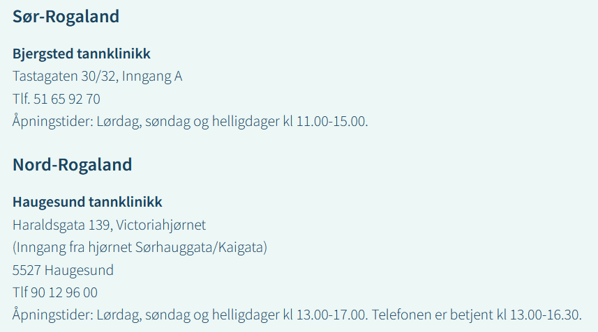 - arkipyhä- ja viikonloppupäivystyksen aukioloajat vaihtelevat seuduittain. Rogalandin läänissä maan lounaskulmassa päivystystä on tarjolla kahdessa kaupungissa, Stavangerissa la-su ja arkipyhät klo 11-15 ja Haugesundissa la-su ja arkipyhät klo 13-17. Vestlandin läänissä, yliopistokaupunki Bergenissä taas ma-pe klo 18-20.30 ja la-su ja arkipyhät klo 15.30-20.30.